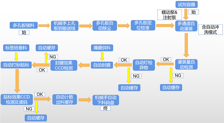 1.多孔板自動化灌裝封膜貼標生產(chǎn)線功能介紹: